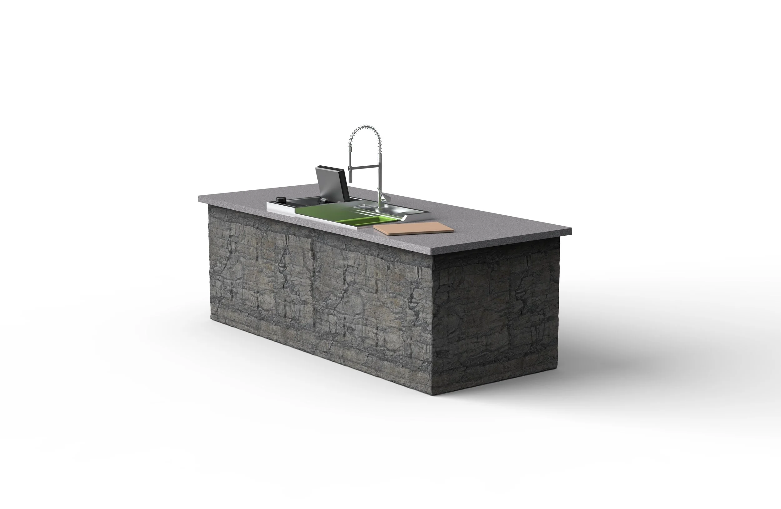 The design centers on a workstation sink that functions as both a cleaning and food prep station. Next to the sink, a rotational induction cooktop serves as the product’s primary interaction. When closed, the cooktop operates as a standard induction stove with precise temperature control, rapid heating, and a high level of safety. When pivoted open, it reveals a modular power port underneath, allowing users to connect bespoke modular appliances such as blenders or mixers directly to the workstation.