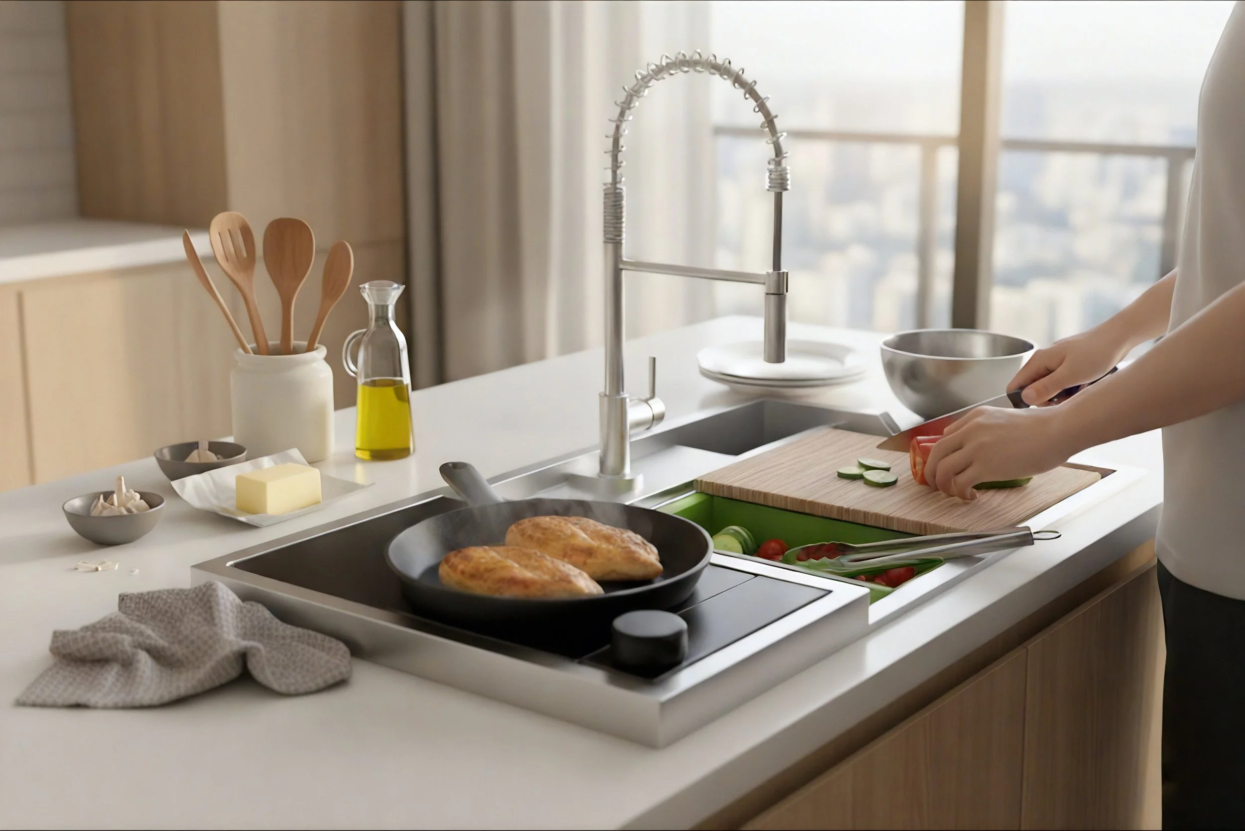 Pivot supports a continuous cooking workflow by allowing users to wash, prep, cook, and operate accessory appliances within a single centralized location. This reduces movement between kitchen zones and lowers barriers to cooking, particularly for users with limited space or experience.